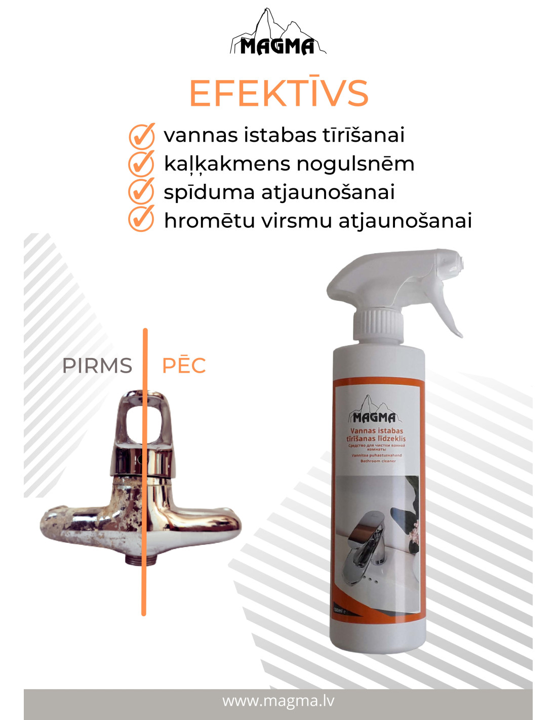 Skirta reguliariam porcelianinių ir keraminių plytelių, kriauklių, maišytuvų, dušo galvučių, tualetų ir kt. valymui. Lengvai pašalina sunkiausias kalkių nuosėdas ir suteikia paviršiui natūralų blizgesį. Efektyviai pašalina nešvarumus, muilo ir vandens nuosėdas.