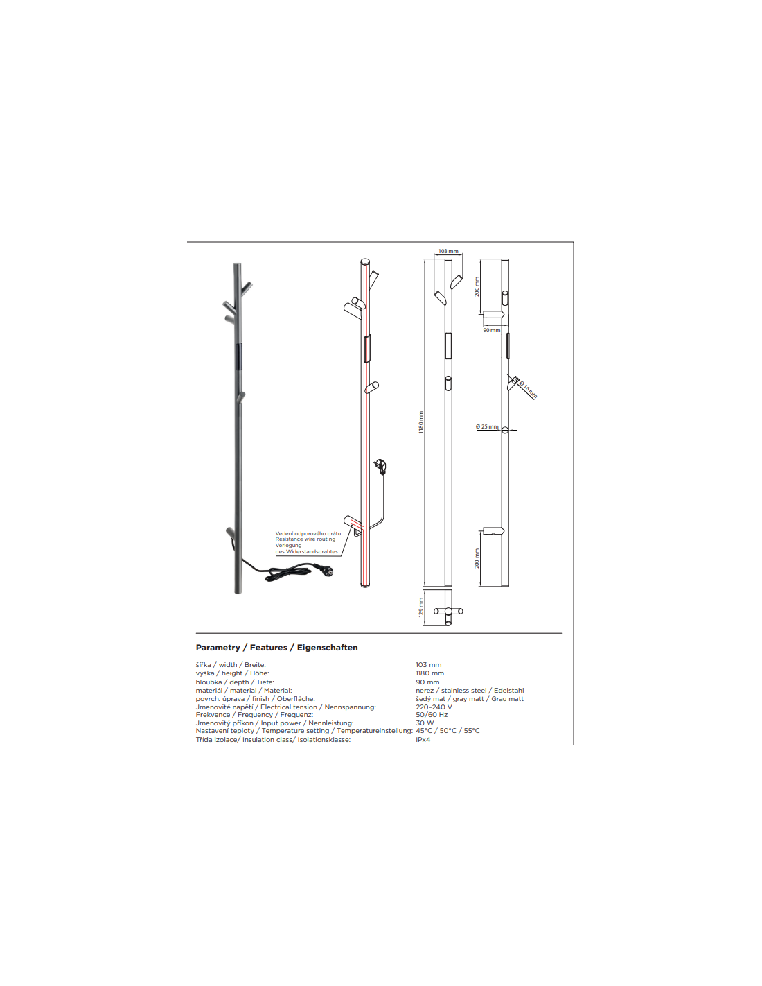 Minimalistiska dizaina cienītājiem piedāvājam elegantu apsildāmu stieni 1180 mm garumā, kas piešķirs jūsu vannas istabai modernu izskatu un ir pieejams vairākās elegantās krāsās. Šie žāvēšanas statīvi ir aprīkoti ar displeju temperatūras un sildīšanas laika iestatīšanai, un tos var papildināt arī ar ērtu pakaramo, ne tikai halāta žāvēšanai (nav iekļauts komplektā). Pateicoties elastīgajai uzstādīšanas metodei - vai nu pieslēdzot kontaktligzdai, vai izmantojot adapteri tieši sienā -, jūs varat izvēlēties risinājumu, kas vislabāk atbilst jūsu vajadzībām.